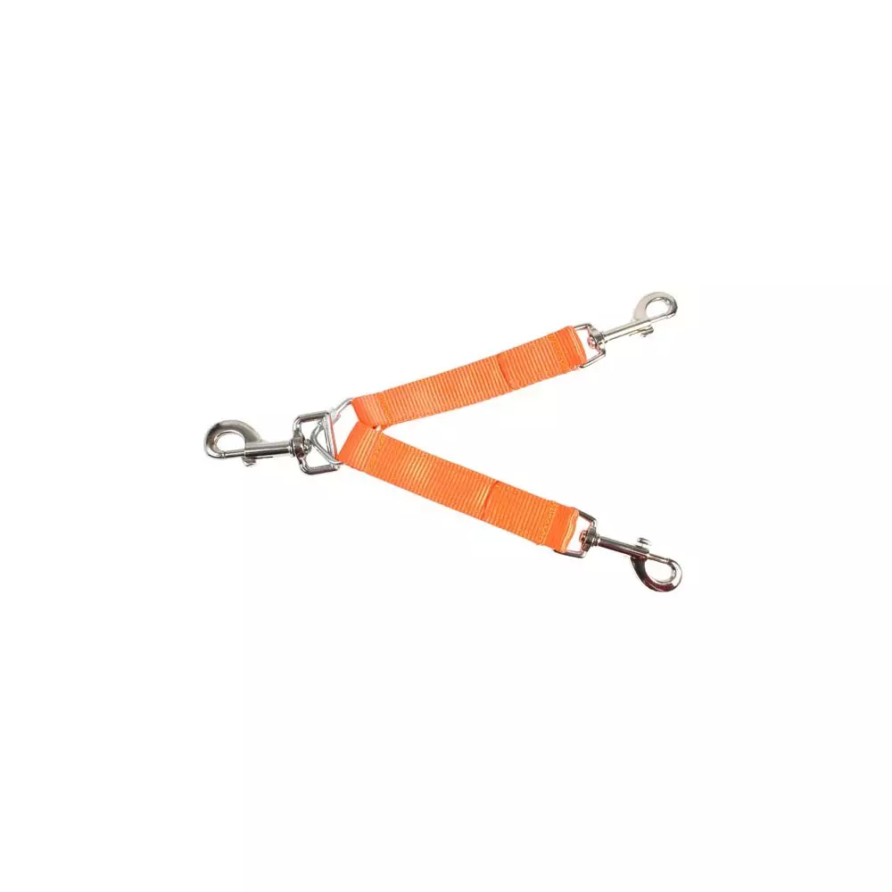 Accouple pour deux chiens de chasse orange. Avec mousquetons. Deux formats disponibles : pour petits chiens 11 cm – pour grands chiens 20 cm.