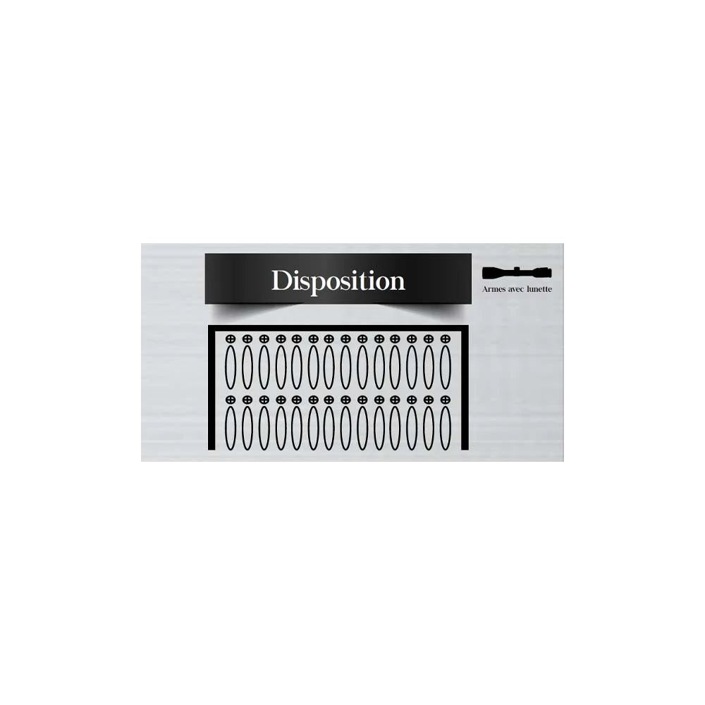 Vos armes reposent sur une mousse haute-densité et anti-corrosion, la crosse se pose sur un tapis au sol. Les armoires fortes Elite Alpha sont équipées de trous pour une fixation murale ou au sol, indispensable pour offrir une sécurité optimale. Il dispose d’un second petit coffre sur la partie supérieure pour vos petits objets précieux, accessoires ou munitions. La disposition des armes à l’intérieur du coffre fort est répartie en deux rangées de 8 armes. L’espace est suffisant pour accueillir des fusils ou carabines surmontés de leurs optiques.