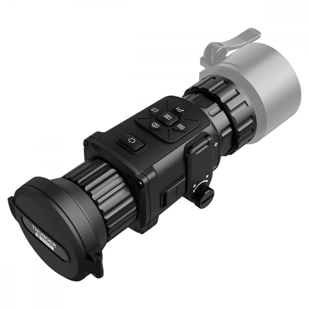 Qu’est ce qu’un Clip-On ? Le Clip-On est un module de tir à imagerie thermique qui prend place devant l’objectif d’une lunette de tir. A l’aide de sa bague adaptatrice, le Clip-On permet donc de transformer votre lunette de tir en lunette à vision thermique. C’est incontestablement l’optique thermique la plus polyvalente puisqu’elle peut être utilisé en mode Clip-On, en simple monoculaire et même en lunette de tir seule. En effet, le Thunder Pro TQ50C, s’il est couplé à un oculaire, est également doté d’un réticule de tir. Lorsqu’installé devant une lunette de tir, le module utilise le réticule de cette lunette, un contacteur présent sous la bague d’adaptation désactive le réticule natif au Clip-On.