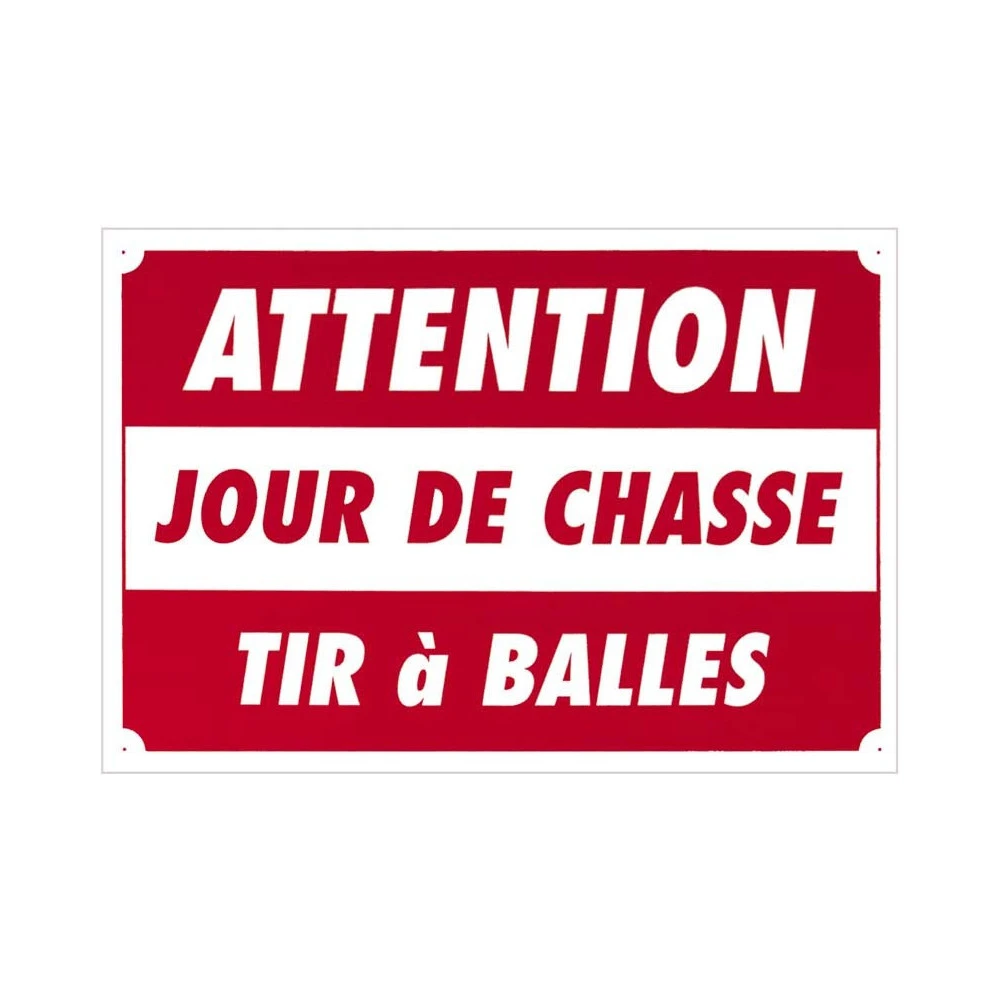 Pancarte fabriquée à partir d’Akilux, matière synthétique, légère, rigide et résistante. Dimensions : 60 x 40 cm. Intitulé du panneau : « Attention Jour de chasse Tir à balles »